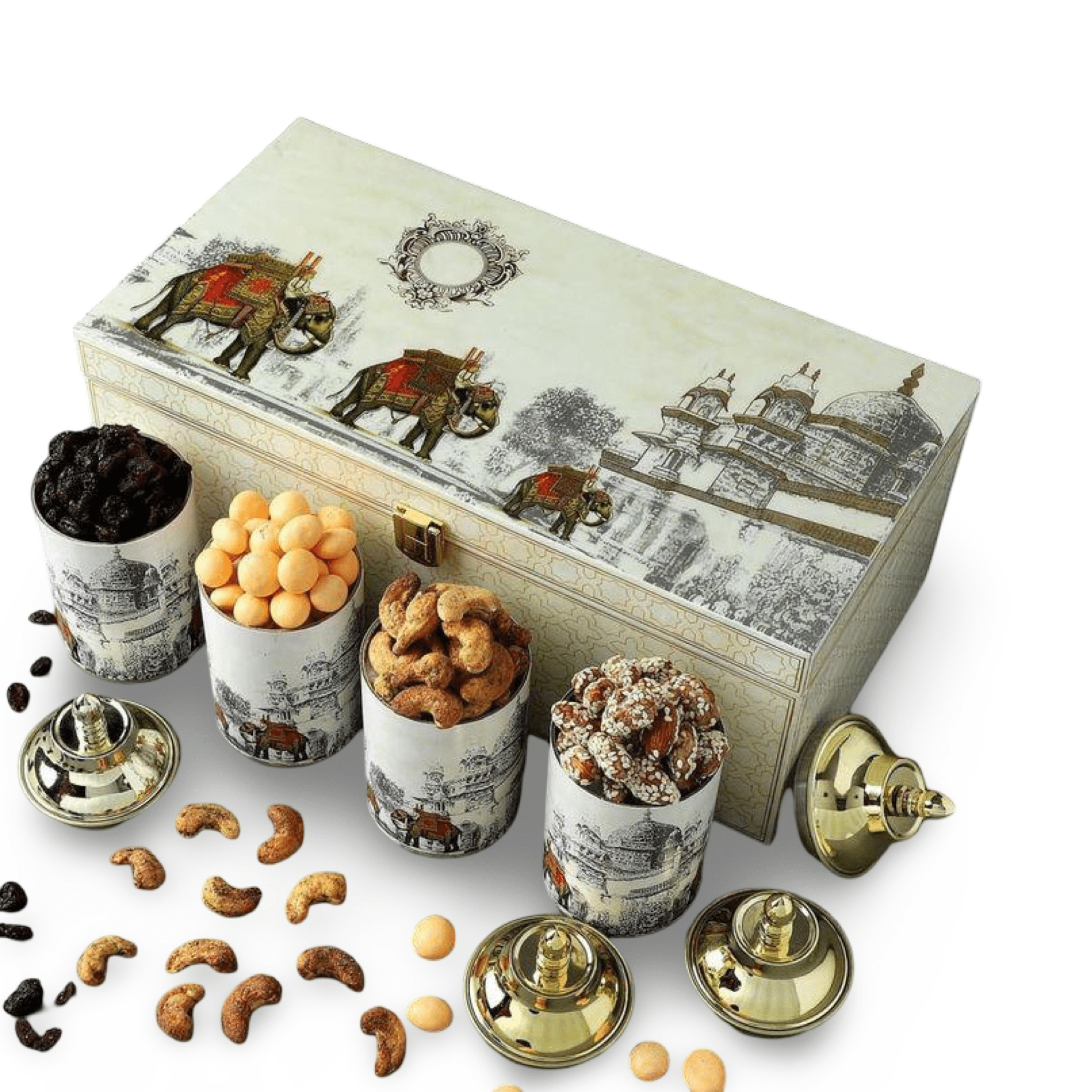 Meet the Hathi Box Set, your new favorite way to serve and store in style! This gorgeous wooden box features a stunning elephant design and comes with 4 matching jars with lids, all adorned with the same intricate pattern. Perfect for serving spices, condiments, or snacks at your next dinner party, or use it to organize your kitchen essentials with a touch of traditional Indian elegance. It's functional, beautiful, and guaranteed to be a conversation starter! Great Diwali Gift.