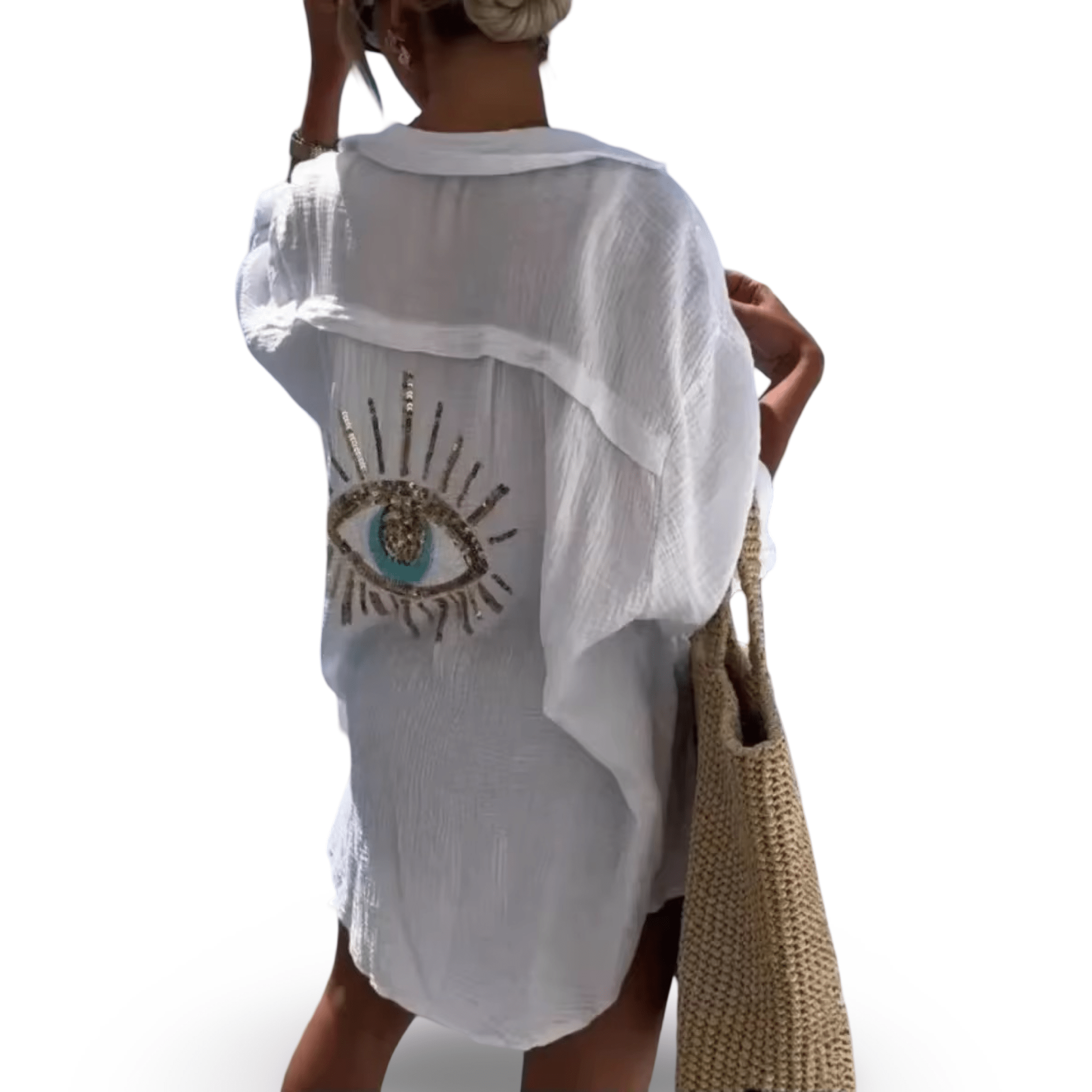 Effortlessly transition from the beach to the boardwalk in the Mina Evil Eye Shirt. This stunning white shirt combines traditional craftsmanship with modern beach style, featuring a dazzling sequined evil eye on the back that offers both protection and elegance.