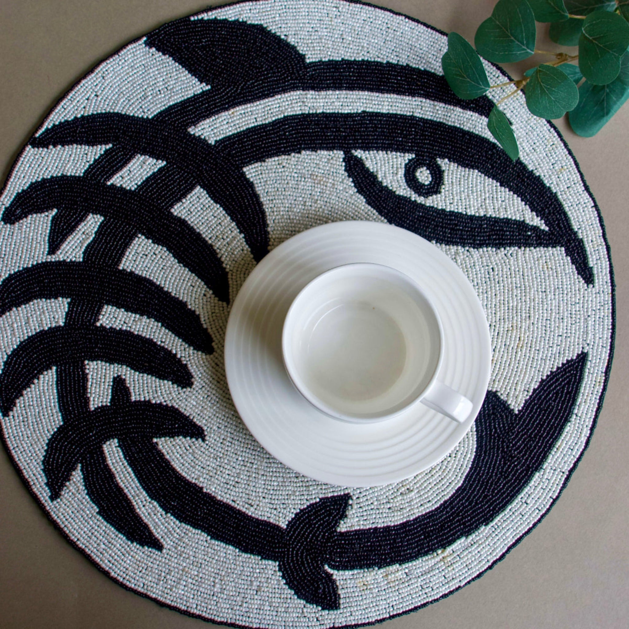 Skilled craftspeople in India create this stunning Sigorei Placemat through meticulous handwork, carefully placing hundreds of tiny glass beads to form playful yet sophisticated geometric patterns that showcase exceptional precision. The striking black and white color palette creates bold visual impact while maintaining timeless elegance that complements any décor style—from modern minimalist to classic traditional. This is accessible luxury—investment-quality craftsmanship at a price point that makes building a complete set achievable.