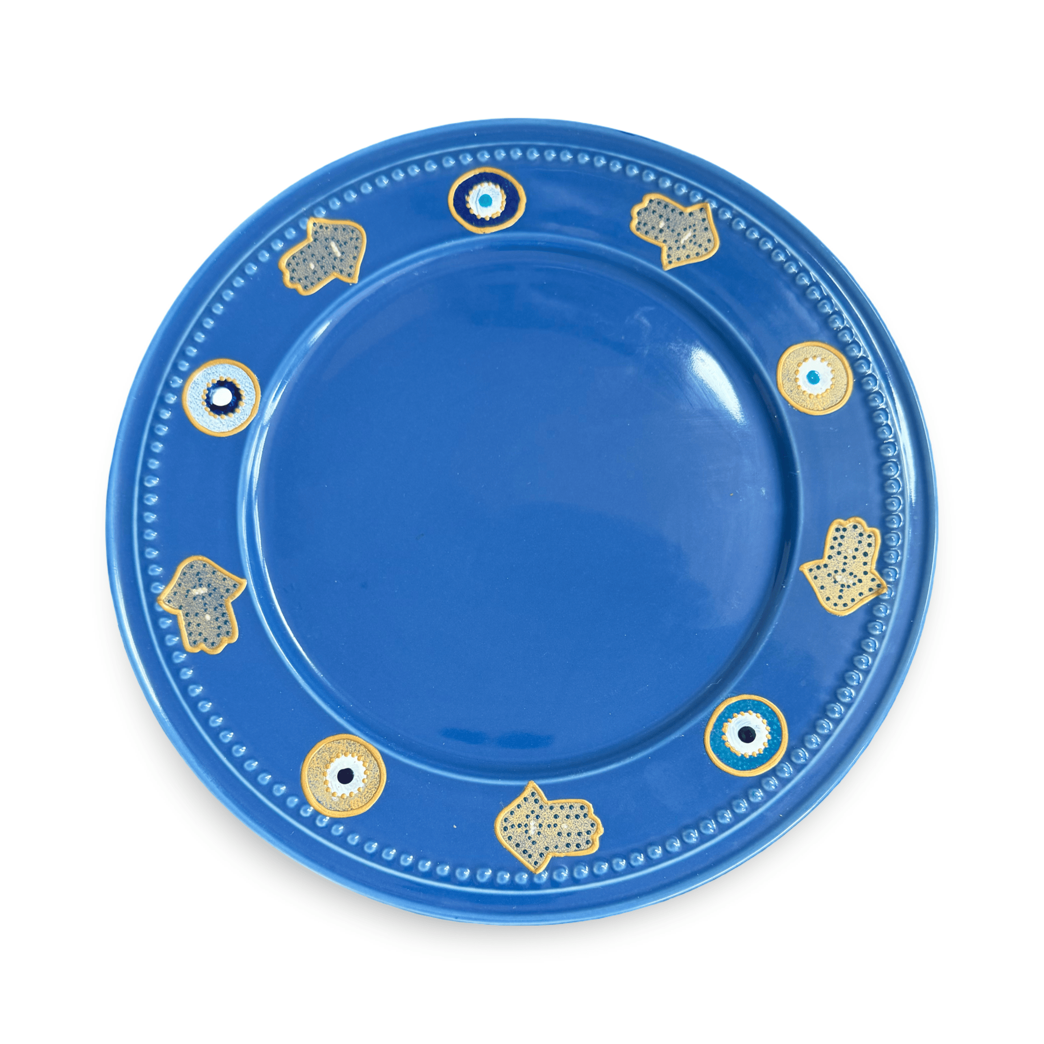 Elevate your table with the spiritual beauty of our Jana Serving Plate from Jordan. This exquisite single serving plate features elegant blue porcelain adorned with hand-painted evil eye and hamsa motifs, creating a meaningful yet sophisticated aesthetic that honors centuries-old protective symbols. Each plate is a work of art, meticulously hand-painted by skilled artisans who bring these ancient symbols to life with delicate brushstrokes. The deep blue hues evoke the Mediterranean sky, while the evil eye and hamsa designs offer both visual intrigue and cultural significance. These protective symbols have been cherished across cultures for generations, believed to ward off negativity and bring blessings to your home. Whether you're serving appetizers, desserts, or simply enjoying a meal, this plate creates an enchanting atmosphere that sparks conversation and appreciation for artistry. The generous size makes it perfect for individual portions, while the striking design transforms everyday dining into a special occasion. Perfectly complemented by our Ruva Serving Spoon, this plate elevates your dining experience with whimsy and charm. Ideal for both everyday use and special gatherings, the Jana Serving Plate brings a touch of global artisan craftsmanship to your table, celebrating the beauty of handmade traditions.