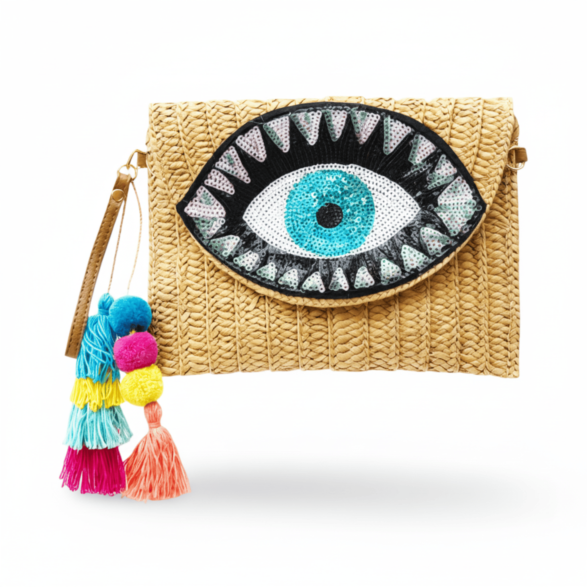The Esther Clutch features intricate sequins with an Evil Eye motif, a removable strap and playful tassels. The meticulous craftsmanship and rich textures make this clutch a true conversation piece that celebrates traditional techniques with contemporary style.