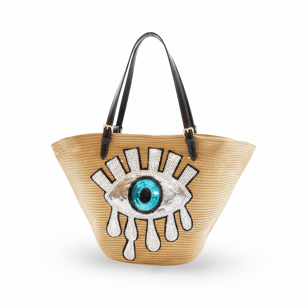 Make a statement with our Leah Evil Eye Beach Bag, where contemporary design meets timeless protection. This striking straw tote features a bold sequins Evil Eye motif that combines modern style with ancient symbolism for your beach adventures.