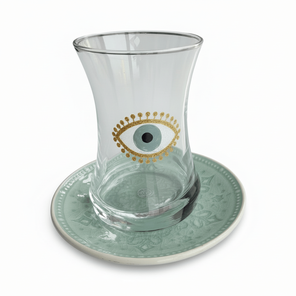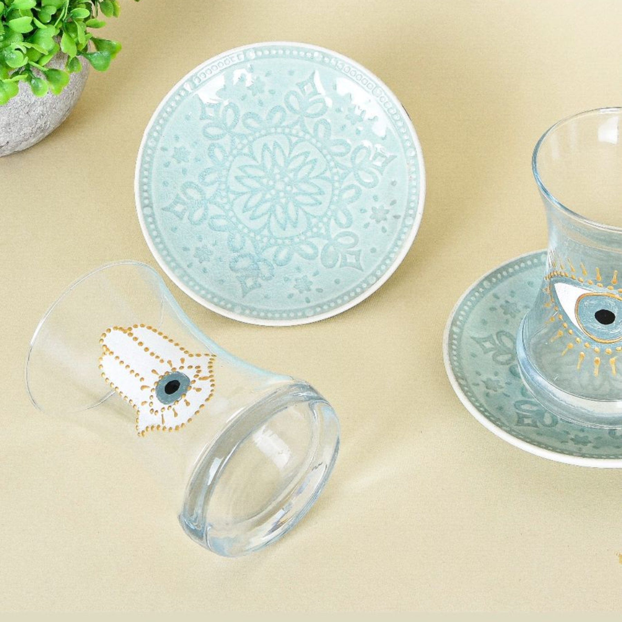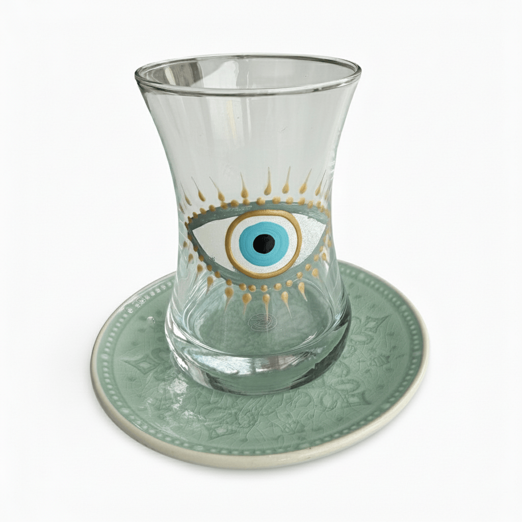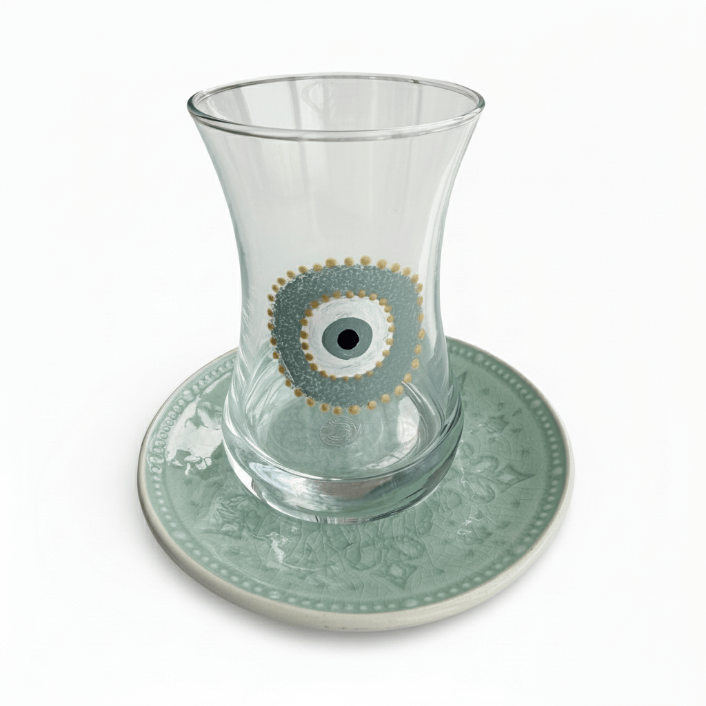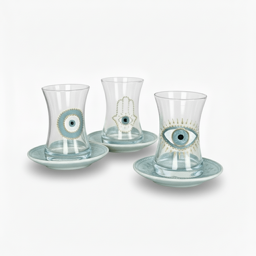 Embrace the richness of Middle Eastern culture with our Salma Teacups from Jordan. Hand-painted by skilled artisans, this set of 6 features three distinct evil eye designs in soothing light blue hues, with two teacups of each style. Each piece is individually painted on delicate glass and porcelain, celebrating generations of Jordanian craftsmanship. Because each teacup is hand-painted, slight variations make every piece uniquely yours. Perfect for serving tea at gatherings or elevating your daily tea ritual, the protective evil eye symbol adds meaningful beauty to every sip. An elegant hostess gift, housewarming present, or thoughtful addition to your own home. For other teacup designs, explore our Big Eye Nazar Teacups, Hannah Teacups, or Rafi Teacups.