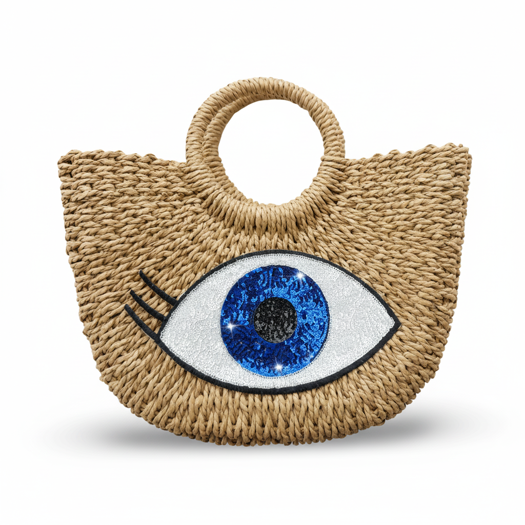 Embrace coastal chic with our Talia Evil Eye Beach Bag, a stunning fusion of traditional craftsmanship and modern beach style. This captivating straw tote features a vibrant sequins Evil Eye design that brings both beauty and protective symbolism to your seaside adventures.