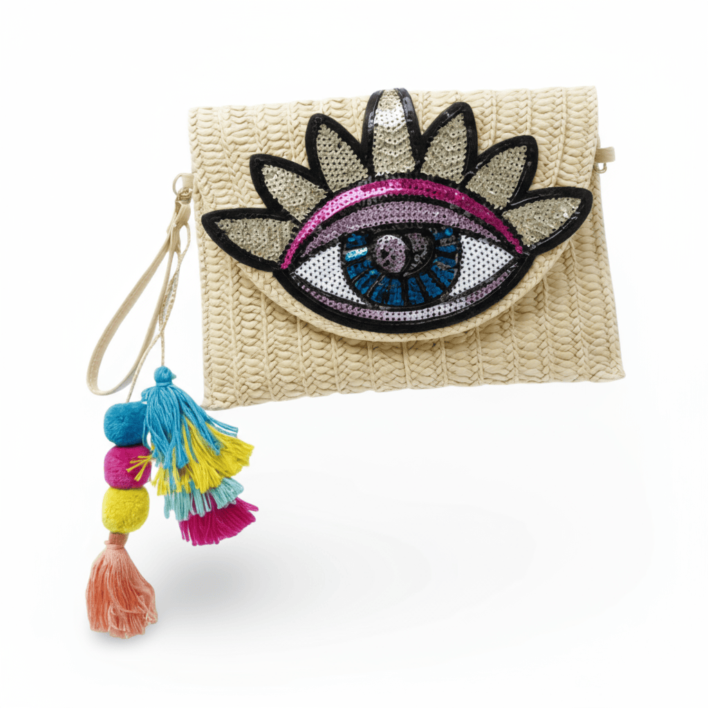 The Yael Clutch showcases intricate sequin work featuring a captivating Evil Eye motif, complemented by a removable strap for styling flexibility and vibrant tassels that add a playful touch. Each piece reflects meticulous attention to detail and celebrates the rich tradition of handwoven artistry with a contemporary twist.