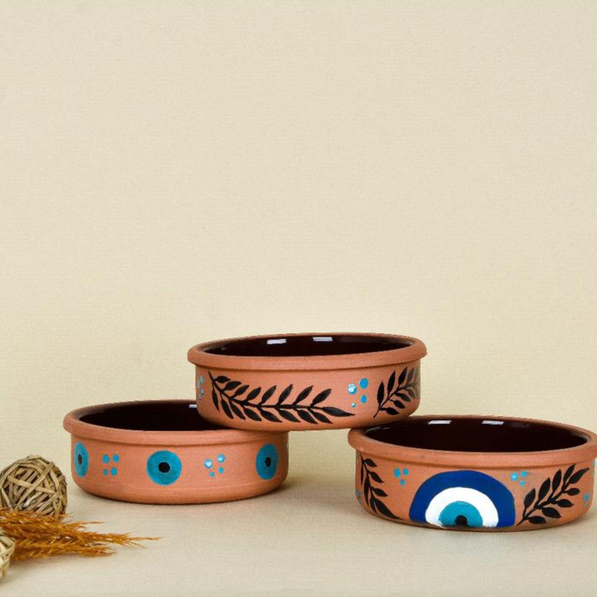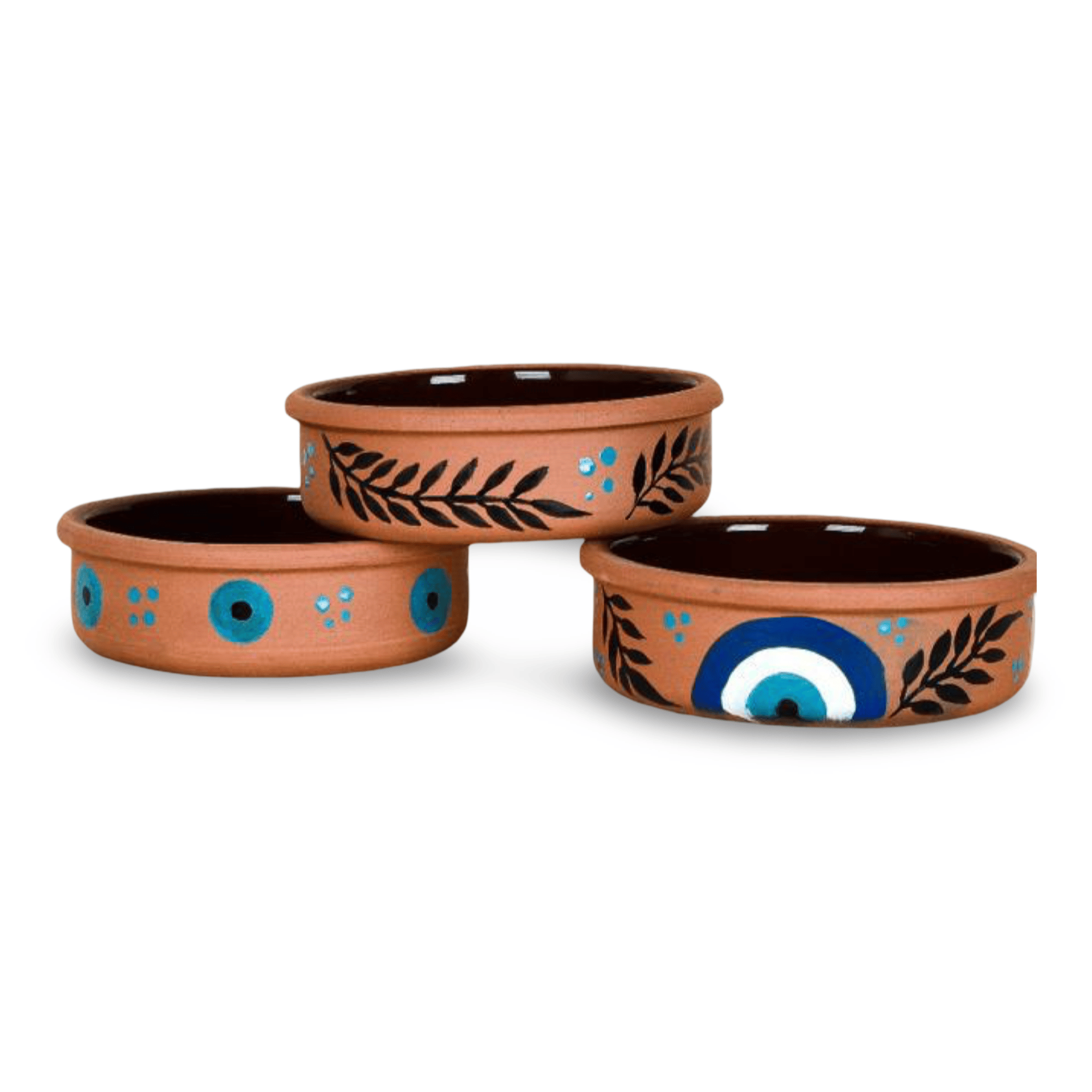 Bring protective symbolism and artisan beauty to your table with this exquisite set of three hand-painted clay ramekins from Jordan. Each piece showcases the iconic evil eye motif—an ancient symbol of protection and good fortune cherished across Mediterranean and Middle Eastern cultures—meticulously hand-painted by skilled Jordanian artisans using traditional pottery techniques passed down through generations. The earthy clay construction paired with vibrant evil eye designs creates a stunning visual contrast that transforms everyday serving into meaningful ritual.