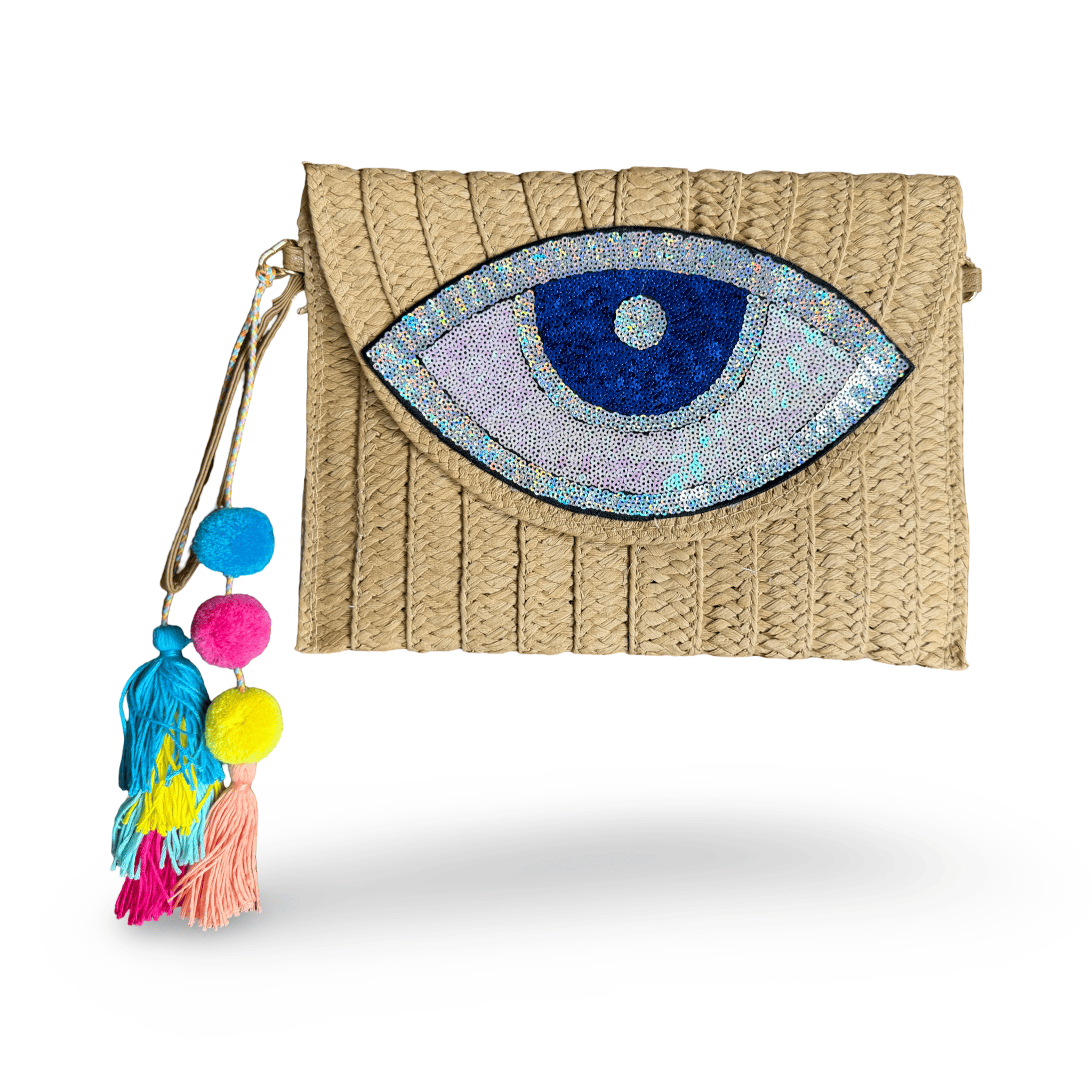 Make your entrance unforgettable with the Dinah Clutch, where bold sequin artistry meets bohemian wanderlust in the most captivating way. Artisans apply hundreds of sequins to create the dramatic evil eye motif—an ancient protective symbol carried across the Silk Road for over 5,000 years, believed to bring good fortune and deflect negativity wherever you go. Against natural beige straw, the sequins catch light with every movement, creating a statement piece that sparkles from every angle. Vibrant tassels add playful swing and movement, perfect for dancing at music festivals, beach weddings, sunset cocktail parties in Hong Kong, or any celebration where you want to stand out from the crowd and be remembered.
