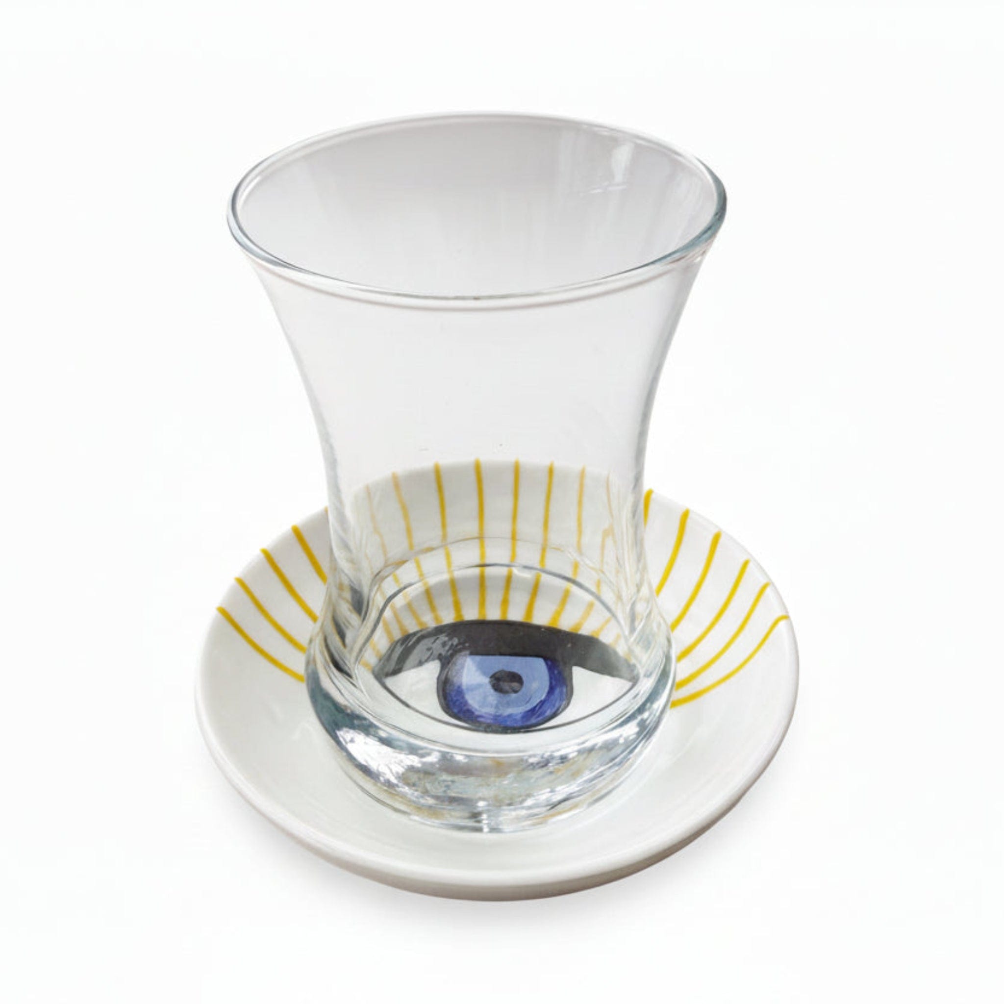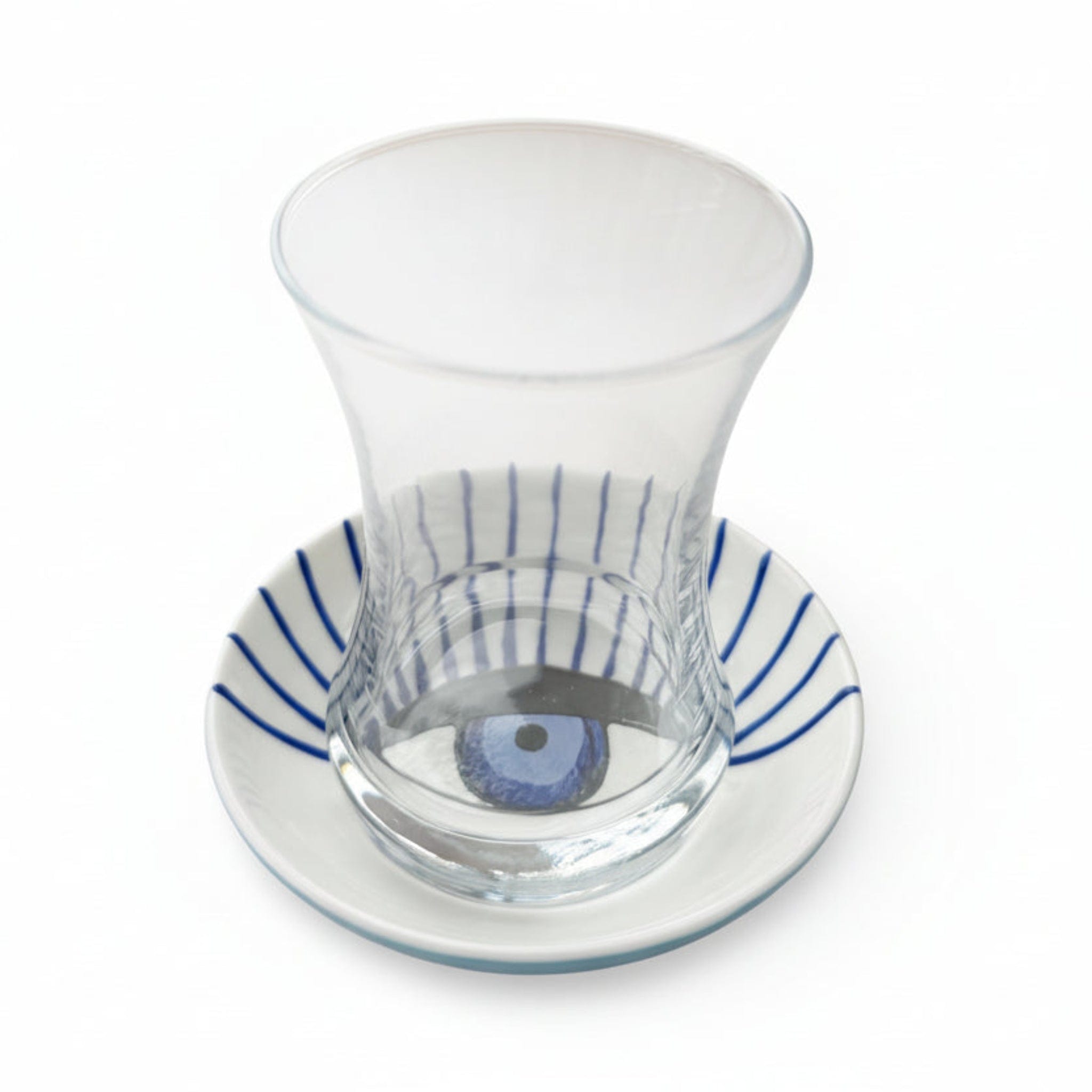 Each saucer in the Iris Teacup set of 6 is hand-painted by skilled artisans, in a beautiful celebration of Middle Eastern culture and the timeless art of hospitality. Artisans carefully hand-paint the distinctive evil eye design onto each uniquely crafted handmade saucer, drawing from traditional Middle Eastern design motifs passed down through generations of Jordanian craftspeople. The protective evil eye symbol has been revered across Mediterranean and Middle Eastern cultures for thousands of years, believed to ward off negative energy, deflect envy, and bring blessings and good fortune to your home and guests. Each delicate brushstroke is applied by hand, requiring exceptional skill, steady hands, and artistic vision to create the intricate patterns with two different and distinctive eyes on the saucer that make these handmade teacups so distinctive and beautiful. The transparent glass allows the hand-painted design to be visible from every angle, creating visual interest and sparkling beauty as light passes through. Because each handmade cup is individually hand-painted, slight variations in the eye design and brushwork make every handmade set uniquely yours—no two sets are exactly alike. These natural variations are hallmarks of authentic artisan work, ensuring your set is truly one-of-a-kind. Best enjoyed with friends and family, this beautiful handmade set is a heartfelt way to show hospitality and invite togetherness, bringing the warmth of Jordanian tradition to your table. Perfect as a meaningful wedding gift, housewarming present, or treasured addition to your own table.