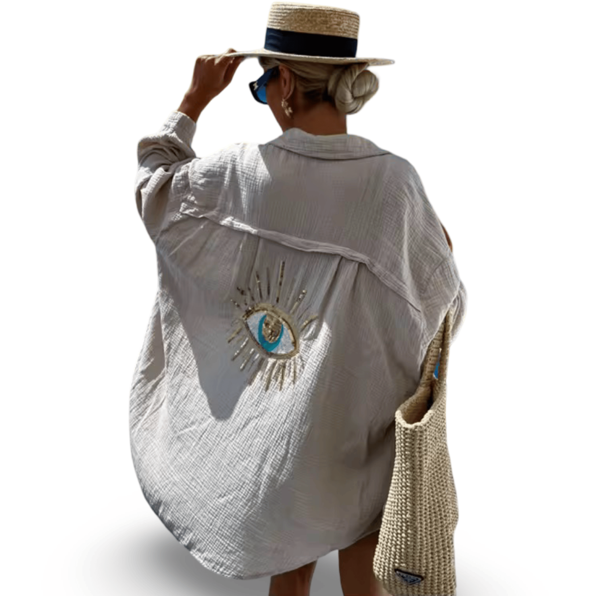 Effortlessly transition from the beach to the boardwalk in the Mina Evil Eye Shirt. This stunning beige shirt combines traditional craftsmanship with modern beach style, featuring a dazzling sequined evil eye on the back that offers both protection and elegance. This versatile piece is perfect for layering over your swimsuit or wearing as a casual summer cover-up. The neutral fabric keeps you cool while providing stylish coverage, making it ideal for warm weather adventures from sunrise to sunset. The evil eye design isn't just beautiful—it carries centuries of tradition, believed to ward off negative energy and bring good fortune. The eye-catching sequined detail adds a touch of glamour to your beach ensemble. Pair with our Damascus Evil Eye Canvas Beach Bag or Cairo Evil Eye Canvas Beach Bag for a coordinated beach look.