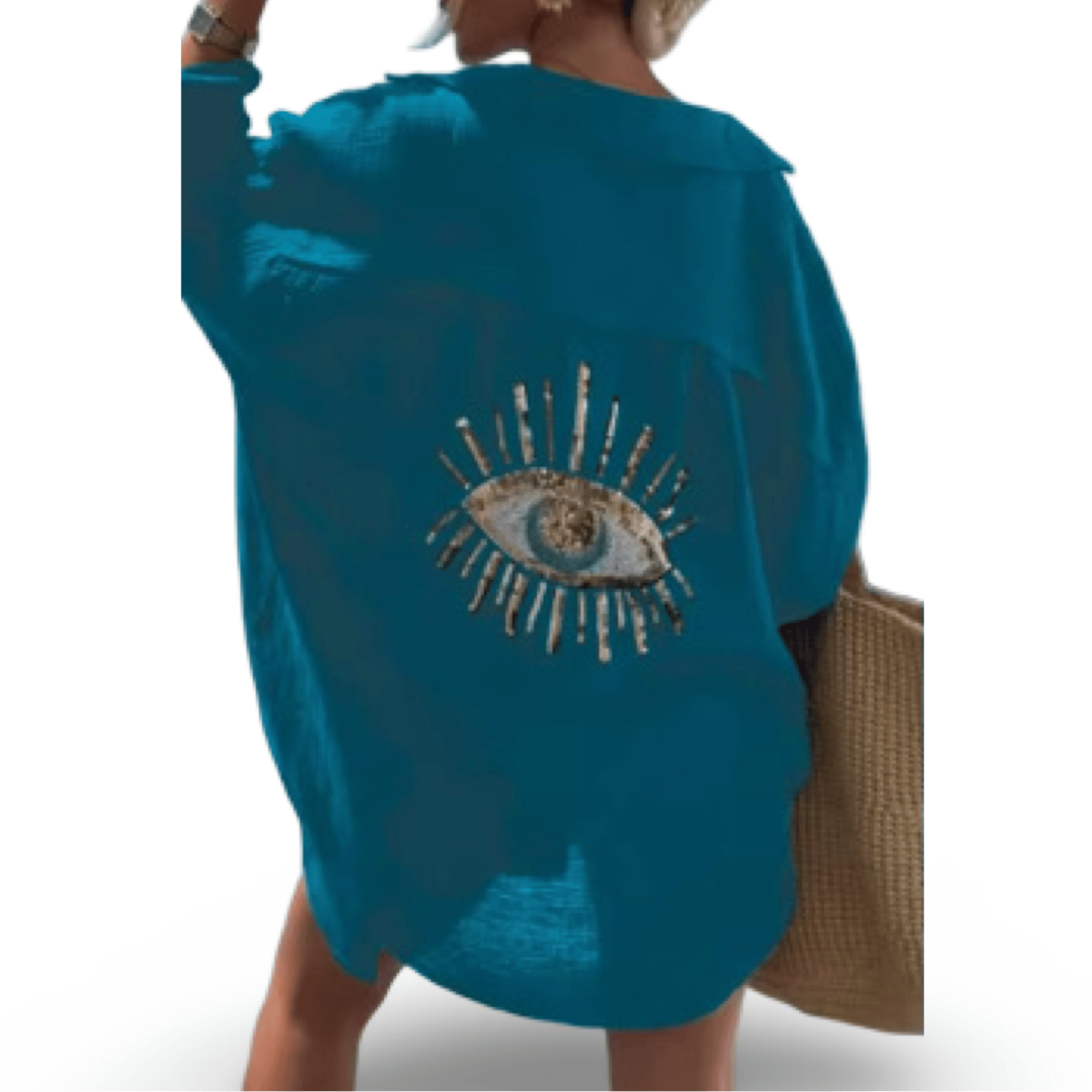 Effortlessly transition from the beach to the boardwalk in the Mina Evil Eye Shirt. This stunning teal shirt combines traditional craftsmanship with modern beach style, featuring a dazzling sequined evil eye on the back that offers both protection and elegance. This versatile piece is perfect for layering over your swimsuit or wearing as a casual summer cover-up. The lightweight teal fabric keeps you cool while providing stylish coverage, making it ideal for warm weather adventures from sunrise to sunset. The evil eye design isn't just beautiful—it carries centuries of tradition, believed to ward off negative energy and bring good fortune. The eye-catching sequined detail adds a touch of glamour to your beach ensemble. Pair with our Damascus Evil Eye Canvas Beach Bag or Cairo Evil Eye Canvas Beach Bag for a coordinated beach look.