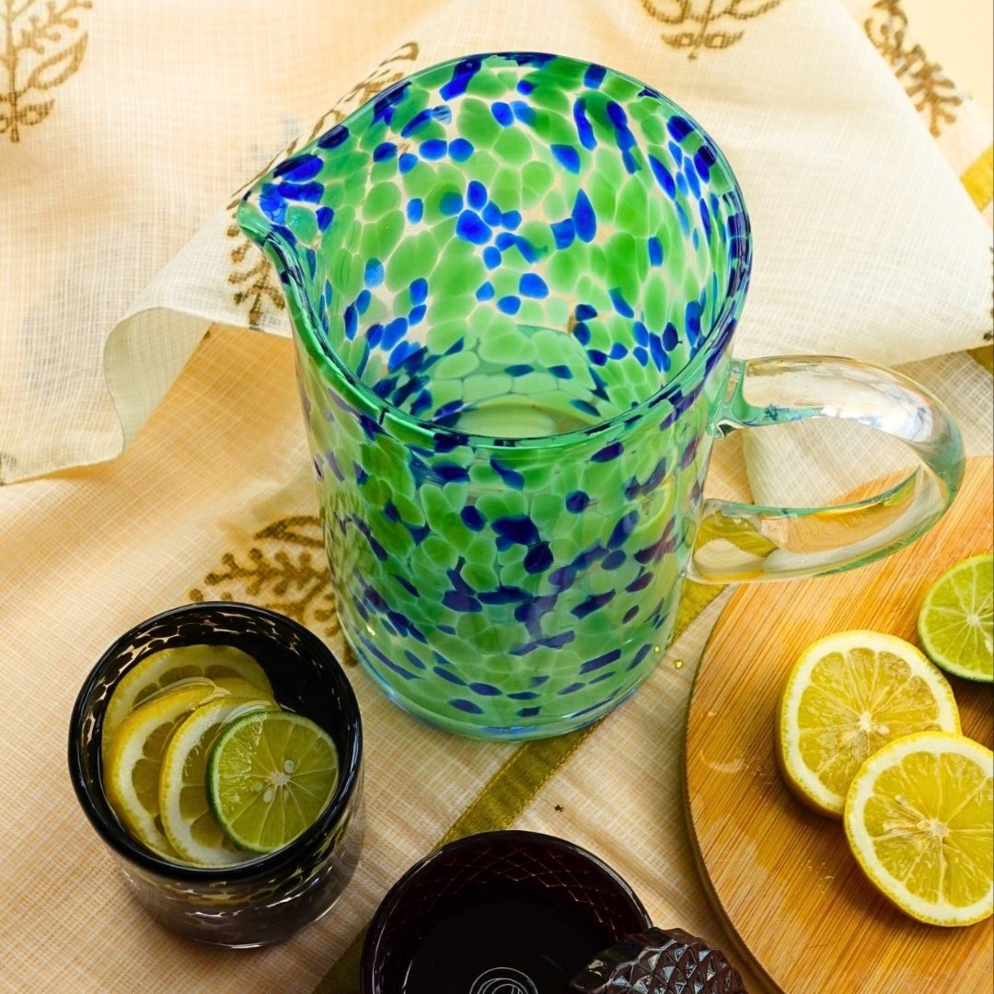 The rich emerald green hue adds a pop of fresh spring color that complements garden-to-table aesthetics: whites, creams, natural woods, and botanical accents. Use it for spring breakfast tables when you're serving fresh juice to the family, for Easter dinner parties when you're pouring wine or water with style, for spring outdoor entertaining when you need a statement piece that travels from kitchen to garden patio, for Mother's Day celebrations, or for iced herbal tea service on warm spring afternoons. The hand-blown nature means each jug carries unique variations in color intensity, bubble placement, and form—small signatures of the artisan's breath and skill that make yours authentically one-of-a-kind. Perfect for the garden enthusiast who values authentic artisan craft, the spring entertainer who believes serving vessels matter as much as what's being served, or anyone who finds peace in nature-inspired aesthetics. An exceptional spring housewarming gift, Mother's Day present, or a meaningful addition to your own collection that celebrates spring's fresh energy. For other hand-blown styles, explore our Alessia Water Glass, Bianca Water Glass and Lucia Water Glass.